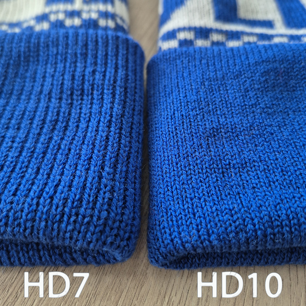 W dłoniach od razu widać, że HD10 to cieńszy, precyzyjny splot, a HD7 to dzianina o większej objętości i miękkości.